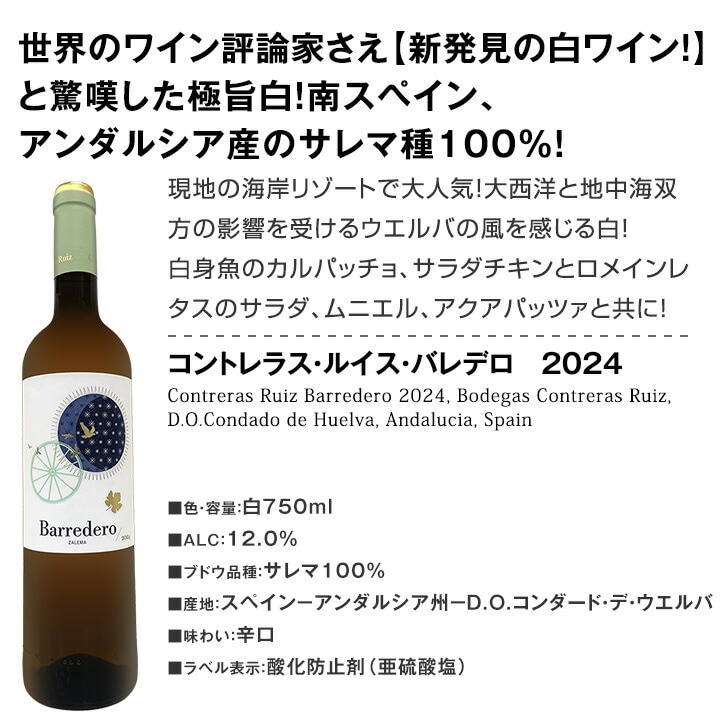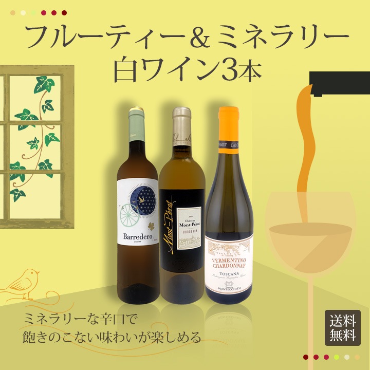 ボルドー最強ワイン『モン・ペラ』超激旨白に、トスカーナ産[ヴェルメンティーノ]と[シャルドネ]の絶妙ブレンド!! そして!!南スペイン、アンダルシア産のサレマ種100%! ミネラリーな辛口で飽きのこない味わいが楽しめる3本です。