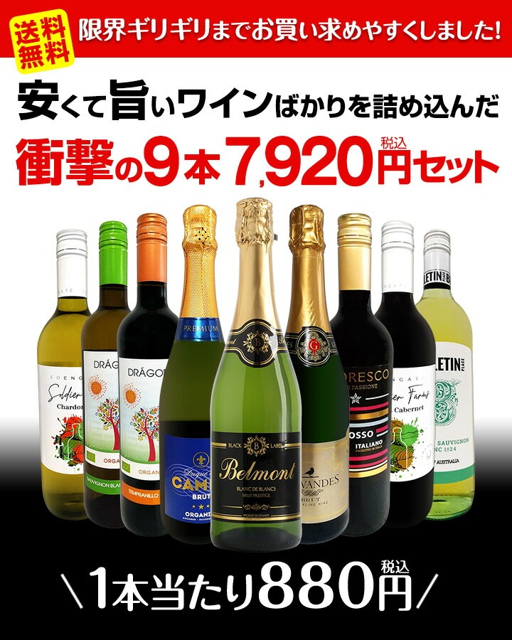 とにかく旨いワインをお買い求めやすく!!! 当店が自信をもってオススメするワインばかりを 限界ギリギリまでお買い求めやすいセット価格にして新登場です! なんと9本で7,920円(税込)!! 厳選したその充実ラインナップ! 当店大人気の極旨辛口スパークリングに 普段飲みにちょうどいい果実味たっぷり赤や白! それが、なんと1本あたり880円(税込)という安さ!