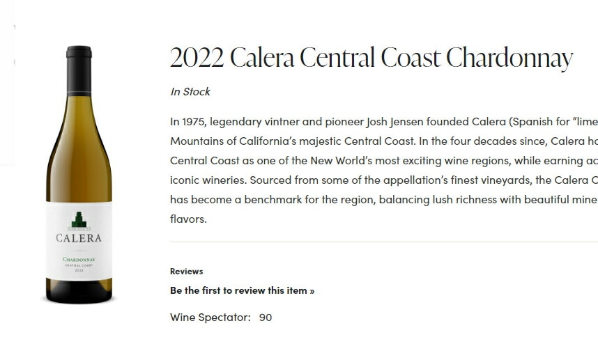 かつて、アメリカ屈指の経済情報紙[Wall Street Journal]紙にて、 70本の20ドル以下のアメリカ産シャルドネが試飲された中で、 最も高い評価を得たのが、この[カレラ・セントラル・コースト・シャルドネ]です。(ヴィンテージは違います)。