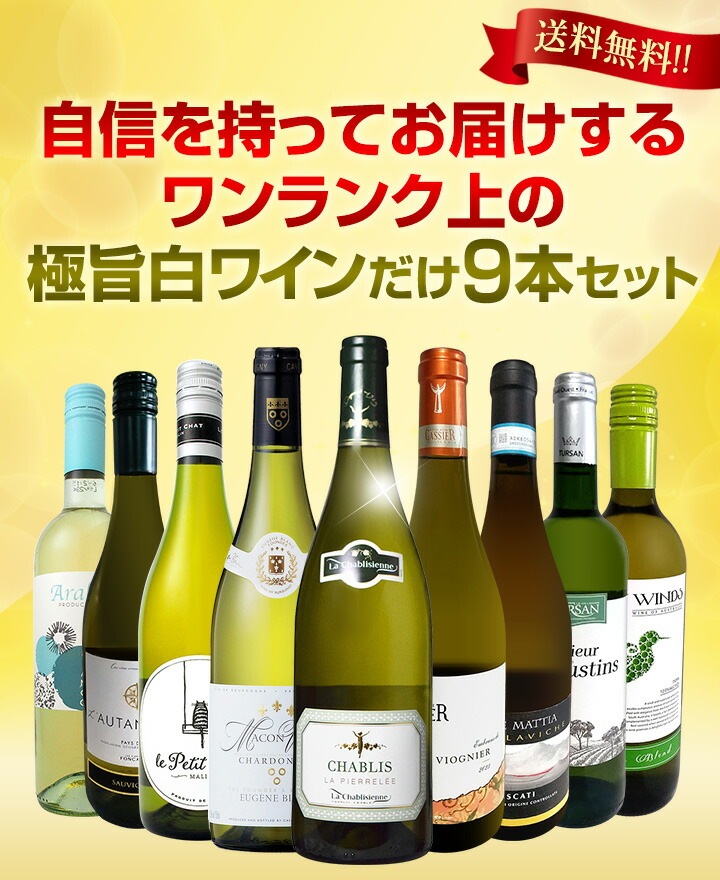 全て格上白ワインがたっぷり9本で16,940円(税込)!! 1本あたり1,883円(税込)! もちろん送料無料でお届けいたします!!