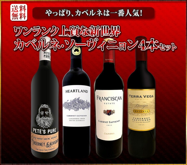 濃厚な果実味が堪能でき、 エレガンスも感じられるカベルネを中心に、 新世界カベルネの醍醐味を味わえる 新世界カベルネ4本セット! 5年ぶりに日本市場に登場したカリフォルニア・カベルネを中心に、 当店独占販売の豪州カリスマのカベルネ、SNSでも大人気のカベルネなど、 ワンランク上質なカベルネを4本厳選しました!