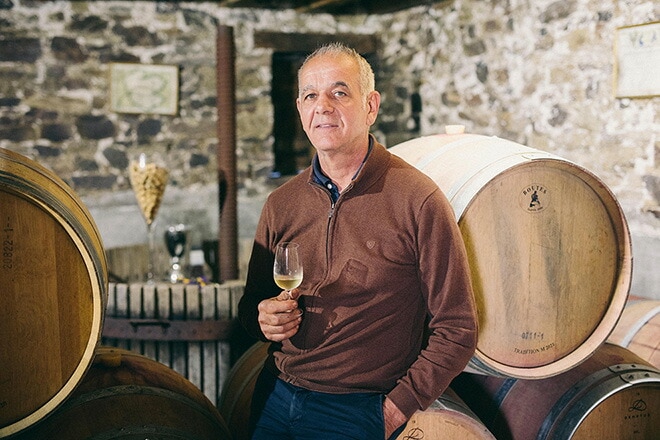 AOPミュスカデ・セーヴル・エ・メーヌはロワール地方を代表する白ワインで、ミュスカデ(ムロン・ド・ブルゴーニュ)から造られます。軽やかで爽やかな酸、繊細なミネラル感、柑橘や白い花の香りが特徴。シュール・リー熟成により、旨味とまろやかさが加わるとワインラバーには昔から定評があります。 一般的なミュスカデが「爽やかさ」を追求する中、ミシェル・デロモーは土壌ごとの個性を深く掘り下げ、驚くほど表情豊かな味わいを生み出しています。 【土壌が語る、ミュスカデの真髄】 ミシェル・デロモーのドメーヌが位置するのは、ロワール地方ミュスカデ地区の中心、モニエール村。なかでも「フィエフ・セニョール」と呼ばれる区画は、片麻岩(Gneiss)という結晶質の岩盤土壌に覆われています。この土壌は水はけが良く、ブドウの根が深くまで伸びることで、地中のミネラルをたっぷりと吸収。その結果、ワインには凛としたミネラル感と奥行きのある味わいが生まれます。 デロモー氏は、こうした土壌の個性を最大限に引き出すため、区画ごとの管理を徹底し、テロワールの違いを明確に表現するワイン造りを追求しています。 【手をかけすぎず、自然に委ねる醸造哲学】 ミシェル・デロモー氏のワイン造りは、自然との対話から始まります。化学肥料や除草剤を一切使わず、有機農法を実践。畑の生命力を大切にし、ブドウが本来持つ力を引き出すことに全力を注いでいます。 収穫はすべて手摘みで行われ、果実の状態を一房ずつ丁寧に見極めながら選別。醸造では自然酵母による自発的な発酵を採用し、人的介入を最小限に抑えることで、ブドウと土地の個性をそのままワインに映し出します。発酵温度は19℃前後に管理され、果汁は重力でタンクに移されるなど、繊細なアプローチが徹底されています。 さらに、シュール・リー熟成を10〜12ヶ月行うことで、ワインに旨味とテクスチャーを与え、時間とともに深まる味わいを実現。清澄剤や酵母の添加を行わず、自然の力に委ねる醸造が、ピュアで透明感のある仕上がりを生み出しています。。 【テロワールを語る、静かで力強いワイン】 「ワインは土地の記憶を語るもの」――それがミシェル・デロモー氏の信念です。彼の手がけるミュスカデは、単なる爽やかな白ワインではありません。畑ごとの土壌の違いを明確に表現し、飲み手にテロワールの旅を体験させることを目的としています。 片麻岩、片岩、花崗岩といった多様な地質が織りなす味わいの違いは、まるで風景を巡るような楽しさをもたらします。ひと口ごとに広がる、土地の息吹と造り手の想い。それは、静かに、しかし確かに心を揺さぶる体験です。 【試飲コメント】 淡い黄金色が美しく、注いだ瞬間に心が弾みます。レモンピールや白い花、火打石を思わせる香り。口当たりはシャープで、キレのある酸と塩味を伴うミネラル感が非常い印象的。余韻には海風のような清涼感が広がり、洗練された味わいが魅力。 おすすめのペアリングは生牡蠣や白身魚のカルパッチョ、塩レモンで仕上げた鶏肉のグリルなど、シンプルで素材の旨味を活かした料理と好相性。飲んでいるうちに表情を変えるため、また一杯、次の一杯と飲みたくなる充実の1本です。