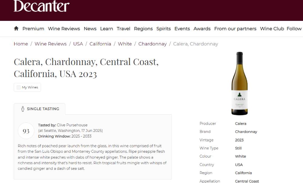 かつて、アメリカ屈指の経済情報紙[Wall Street Journal]紙にて、 70本の20ドル以下のアメリカ産シャルドネが試飲された中で、 最も高い評価を得たのが、この[カレラ・セントラル・コースト・シャルドネ]です。(ヴィンテージは違います)。