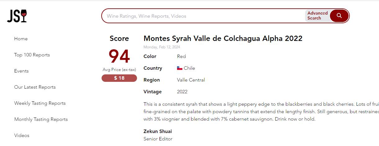 モンテスの赤はカベルネだけじゃない!濃厚シラーは超オススメ! 今ヴィンテージも評価誌94点を獲得! シラーに3%のヴィオニエを加えて一緒に発酵させる手法!。コート・ロティを意識したスタイルのシラー!